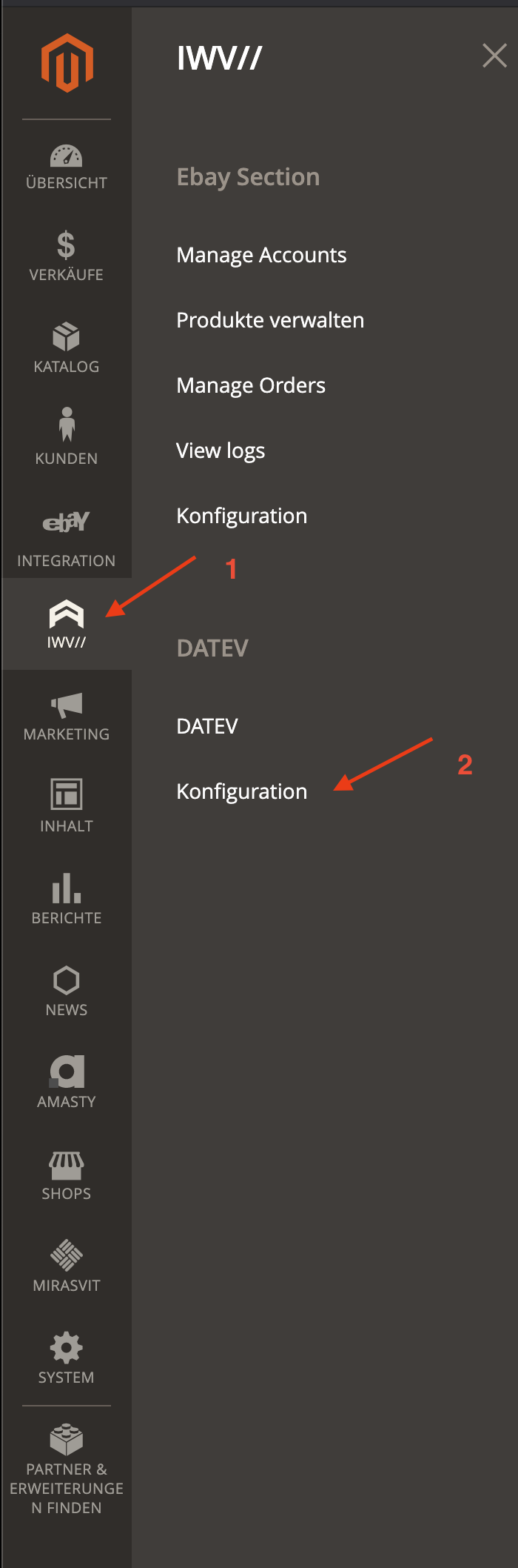 Klicke auf das IWV Icon (1.) in der linken Sidebar und anschließend auf DATEV Konfiguration (2.)