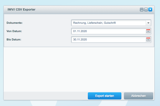 Einfach das Datum und die Dokumente auswählen und kindeleicht den CSV-Export erstellen.