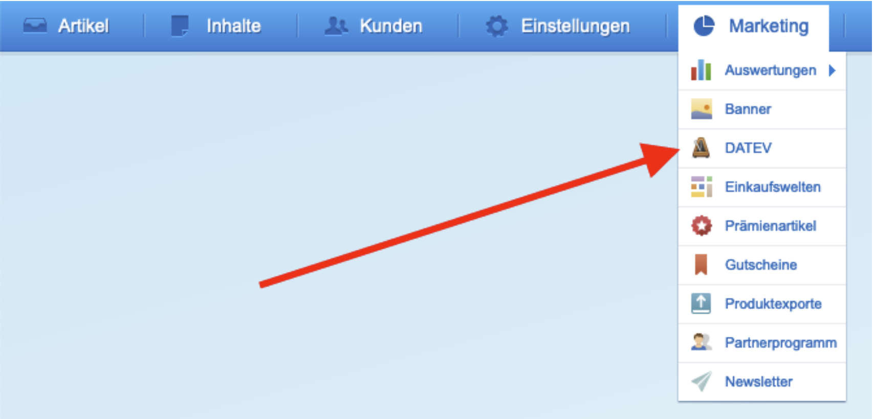 Klicke, nach abgeschlossener Konfiguration, auf Marketing um zum DATEV Export