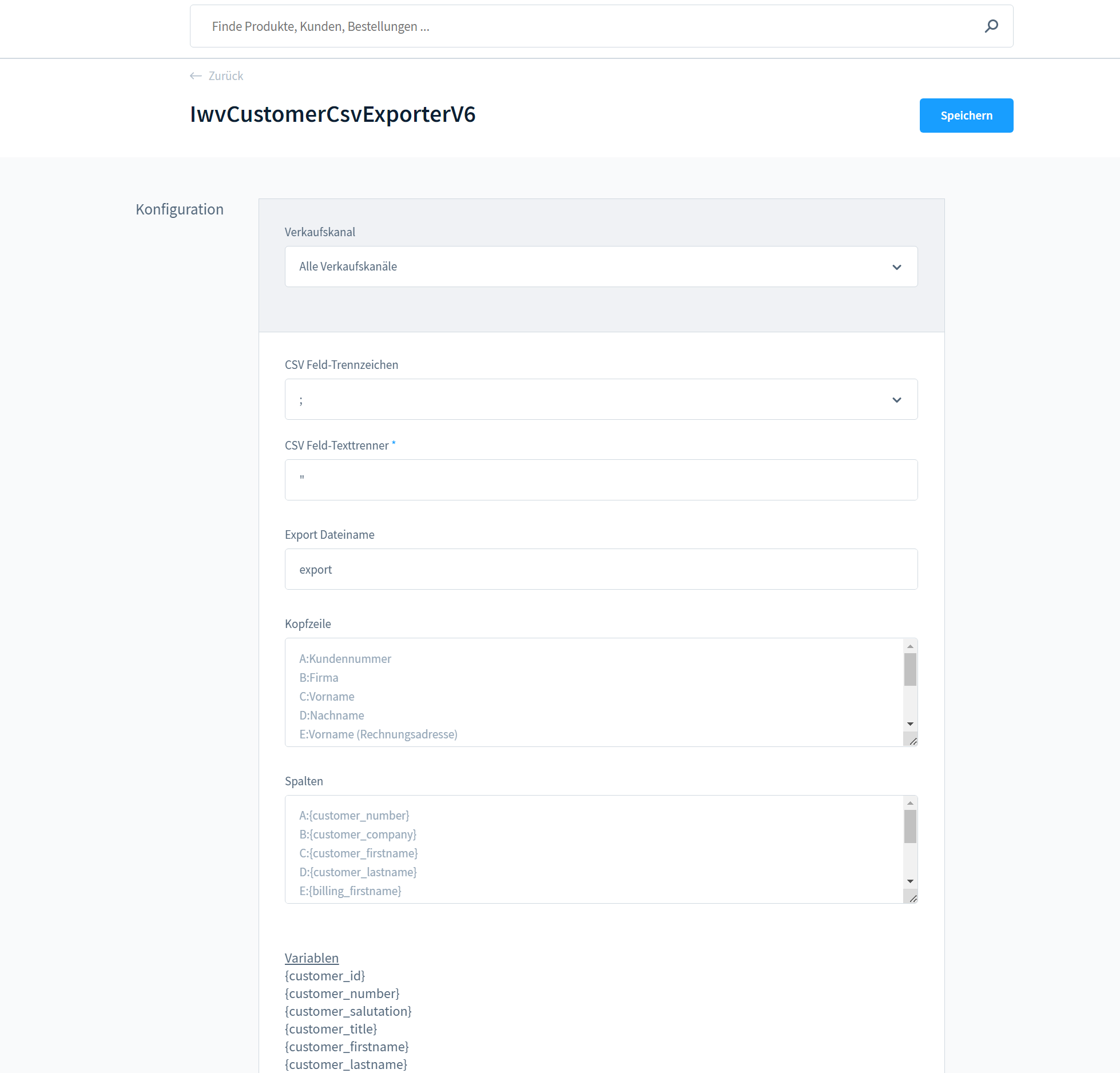 Über die Textfelder "Kopfzeile" und "Spalten" kannst Du den Inhalt des Exports individuell festlegen. Trage hierzu einfach die Variabel ein die Du exportieren möchtest. Über das Spalten Attribut (A:, B: etc..) legst Du fest in welcher Spalte die Variabel oder der Text der Kopfzeile geschrieben wird.