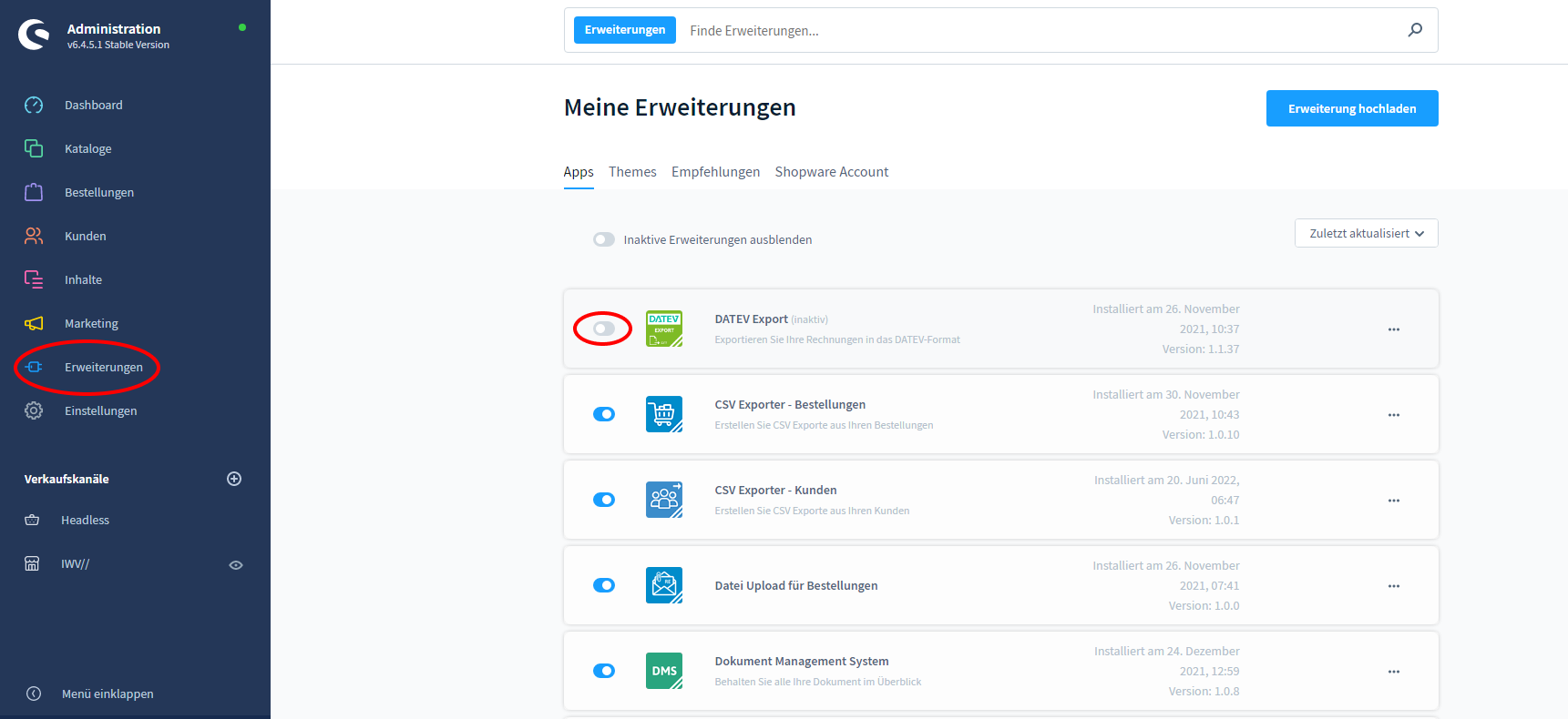 Tätige den Regler in Erweiterungen -> Meine Erweiterungen um das Plugin "Export für DATEV" zu aktivieren.