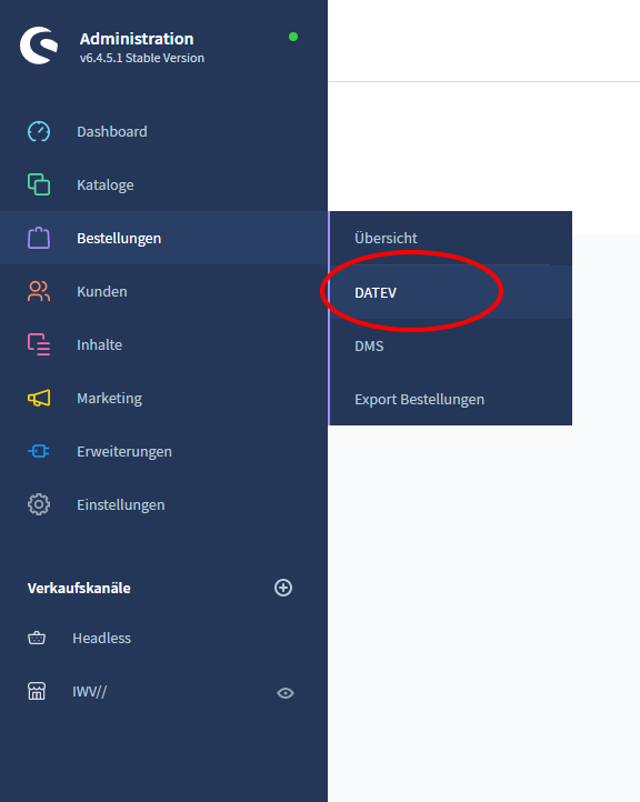 Es erscheint nun im Menü unter Bestellungen der Eintrag DATEV